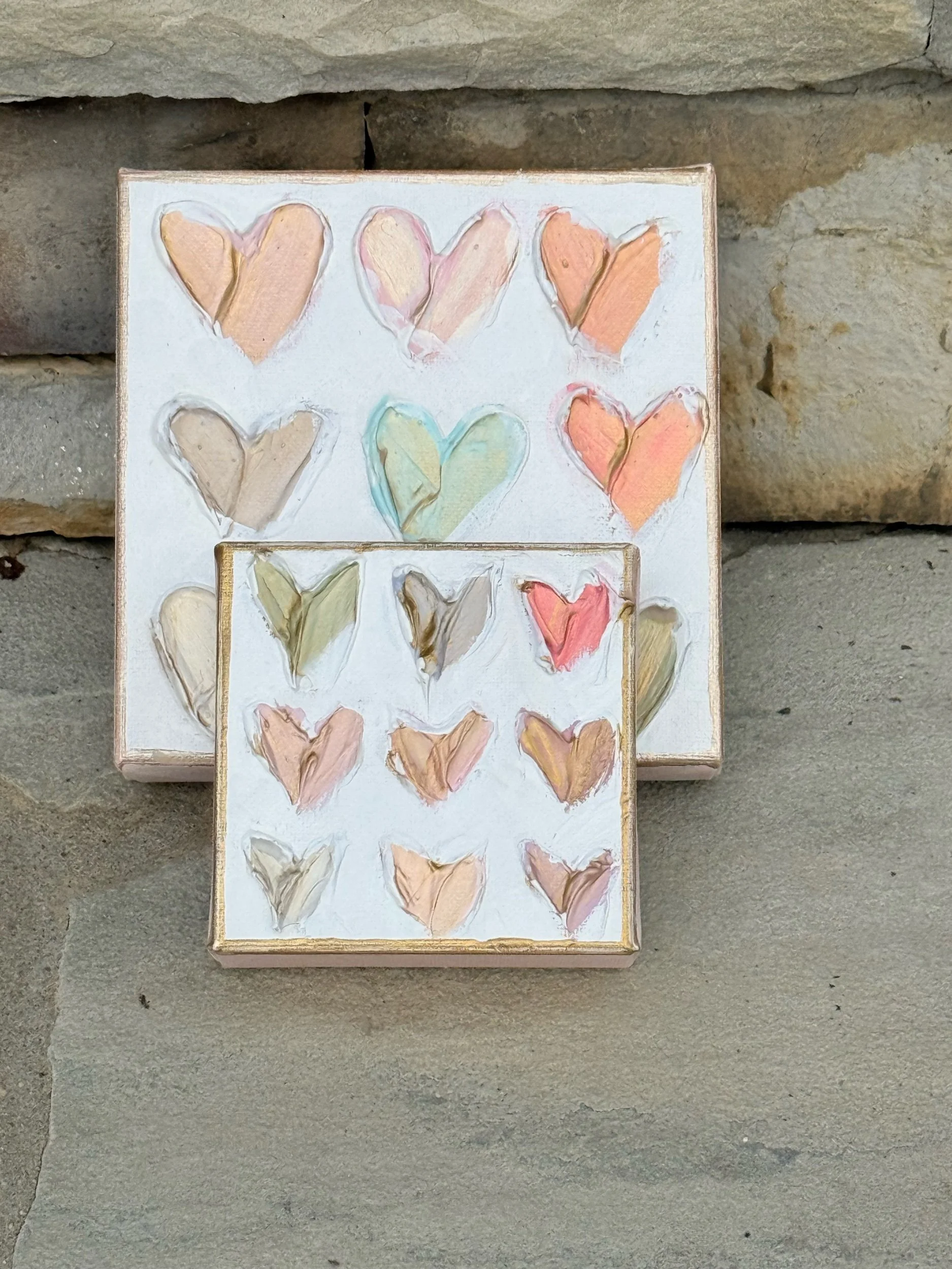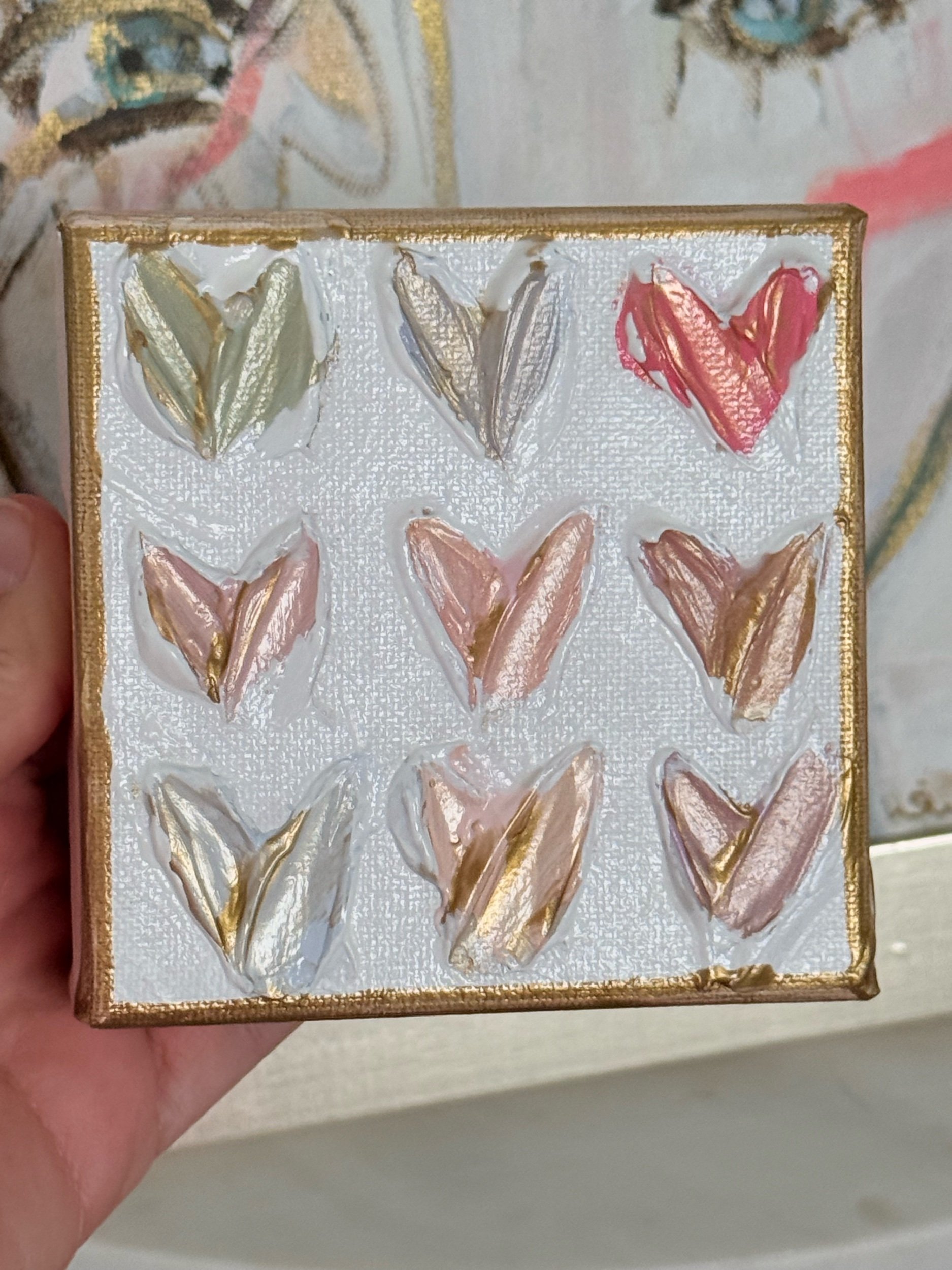 Each Mini Mini features 9 hand-painted abstract hearts, layered with joyful color, texture, and movement. No two are exactly alike. The imperfections are intentional, celebrating the heart of this collection: love is layered, love is colorful, and love is beautifully messy.
